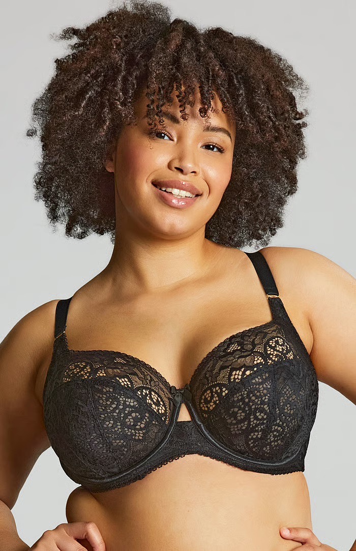 Red embroidery on black mesh creates a stunning tattoo effect, whether its in deep plunge or supportive full cup.